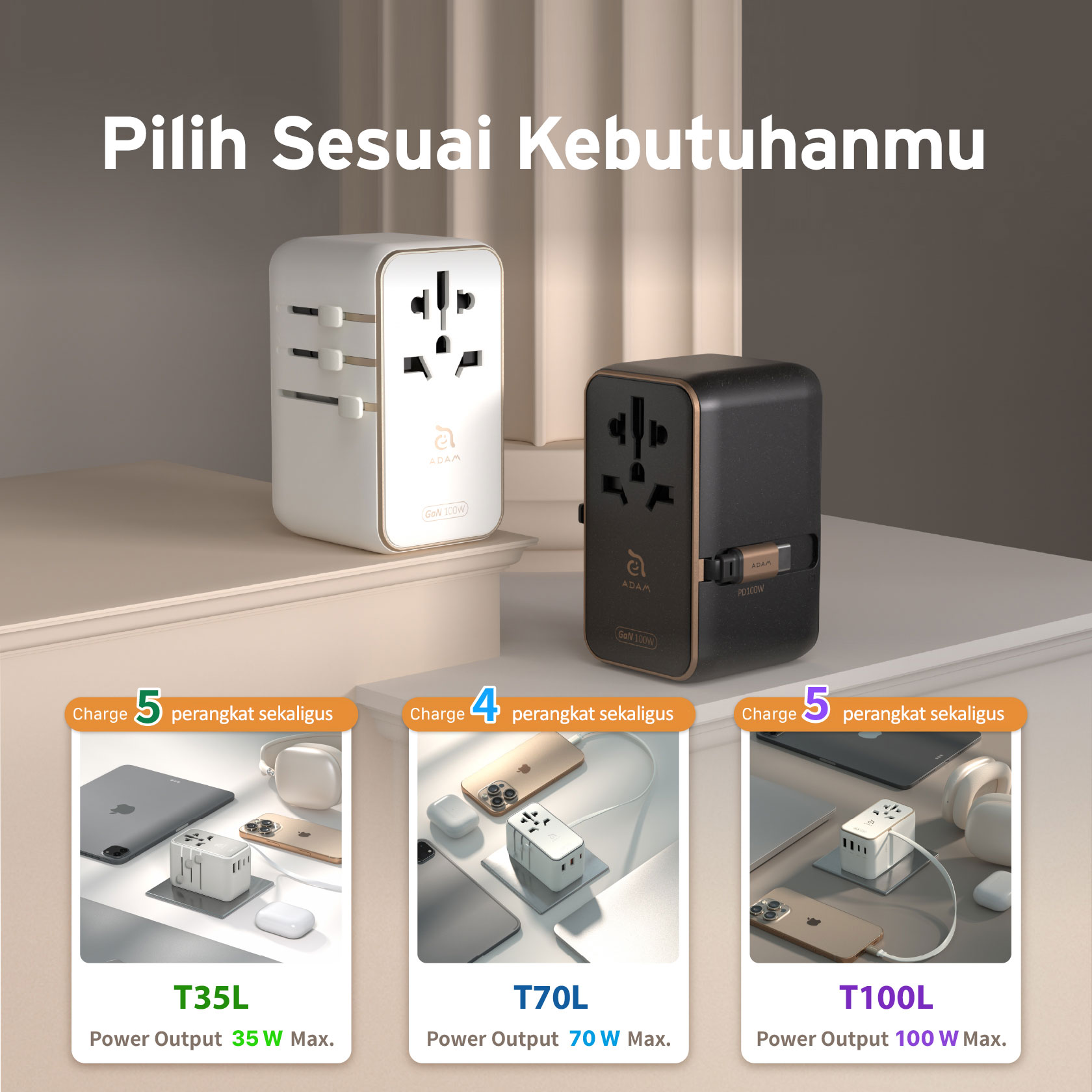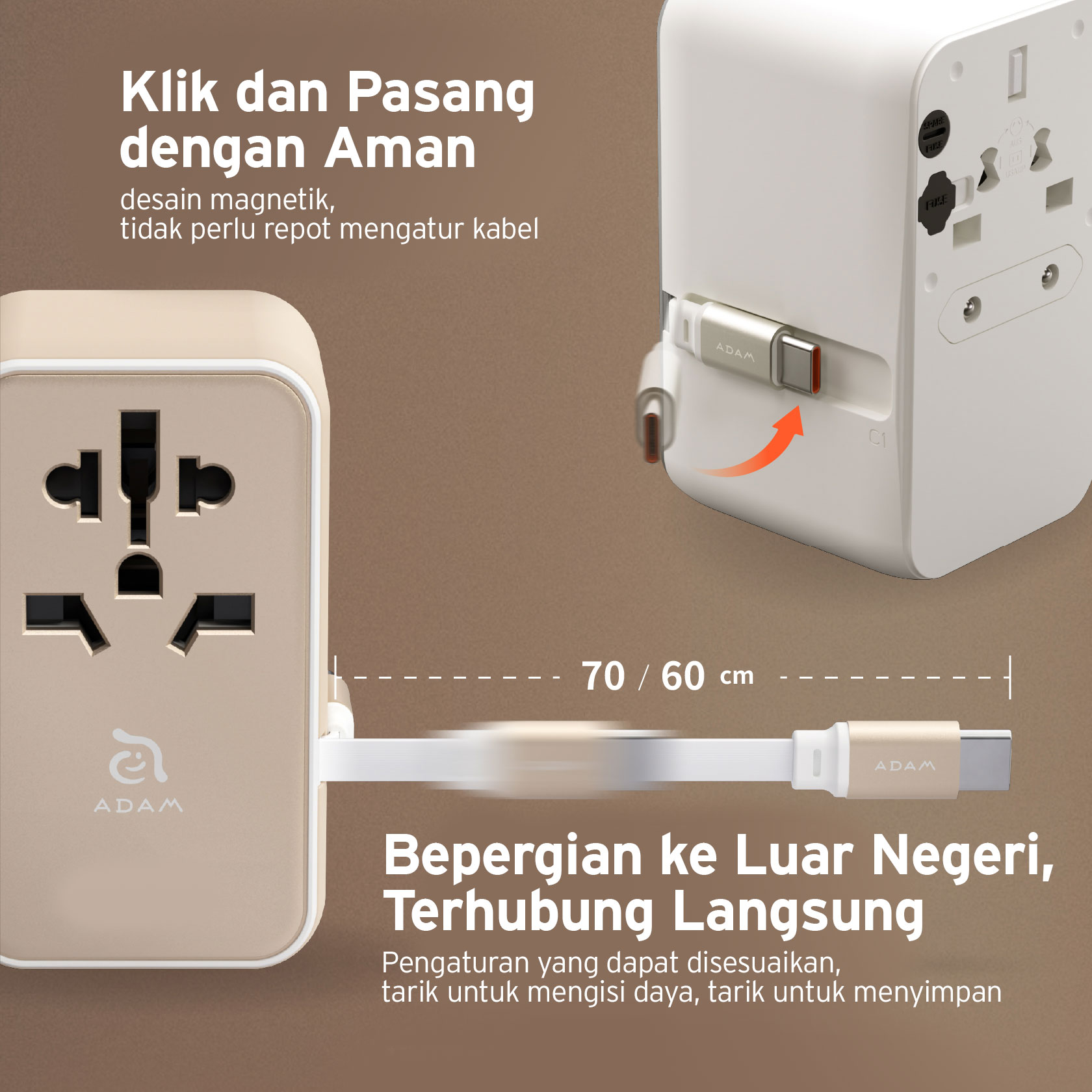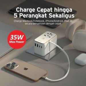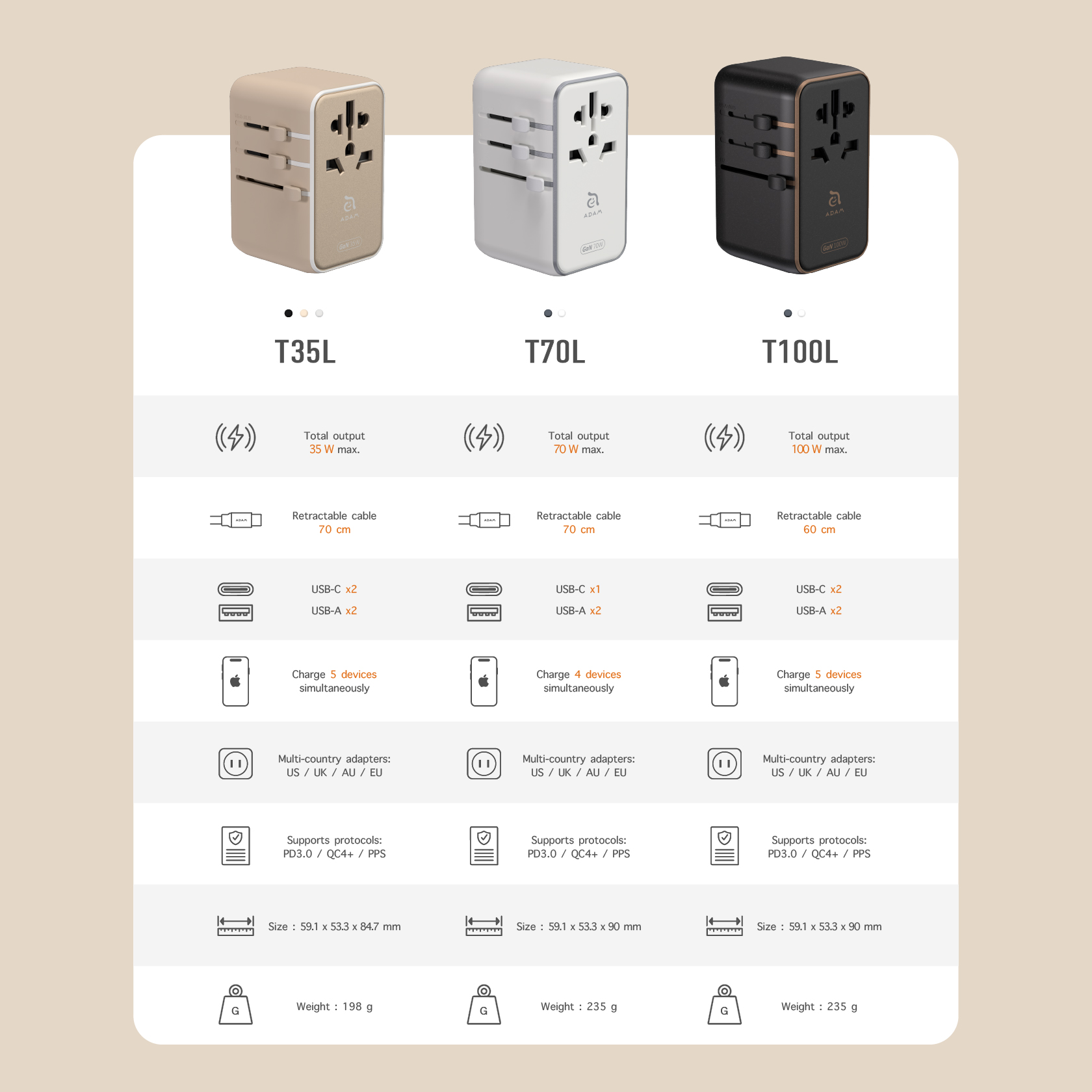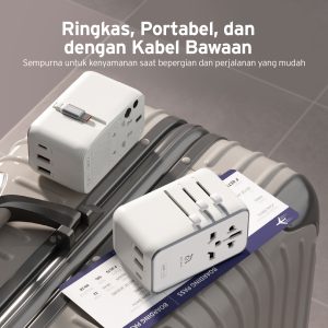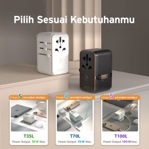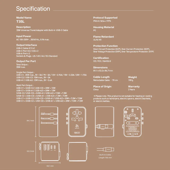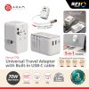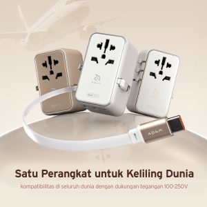 ADAM ELEMENTS – OMNIA T35L TRAVEL ADAPTER WITH BUILT IN USB C CABLE 70 CM – 35W GAN – 2X USB C PORT – 2X USB A PORT – SILVER (840741117465)