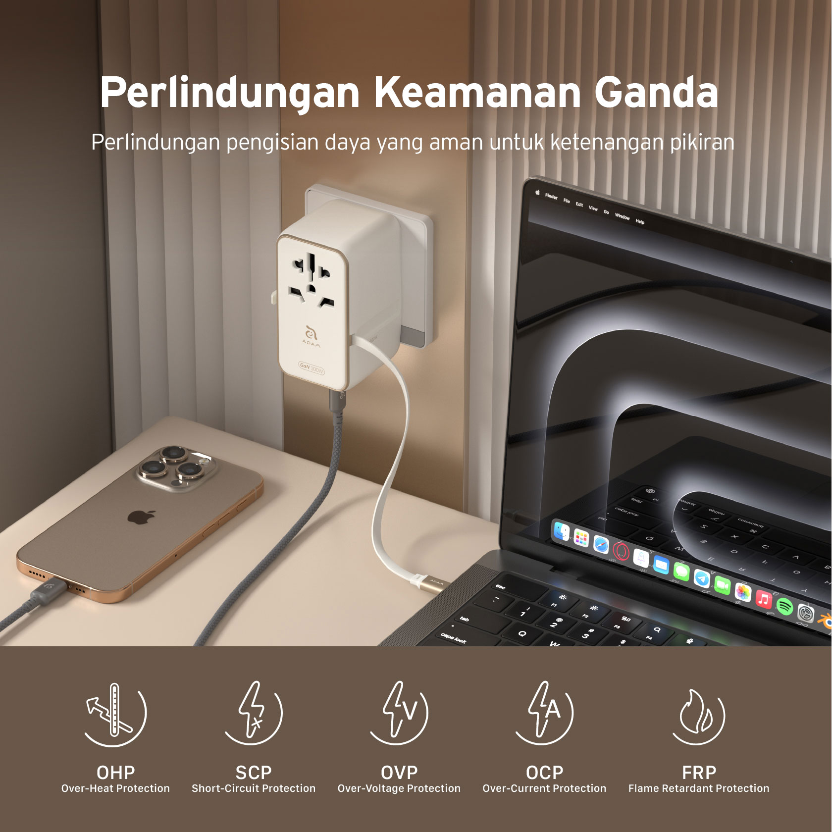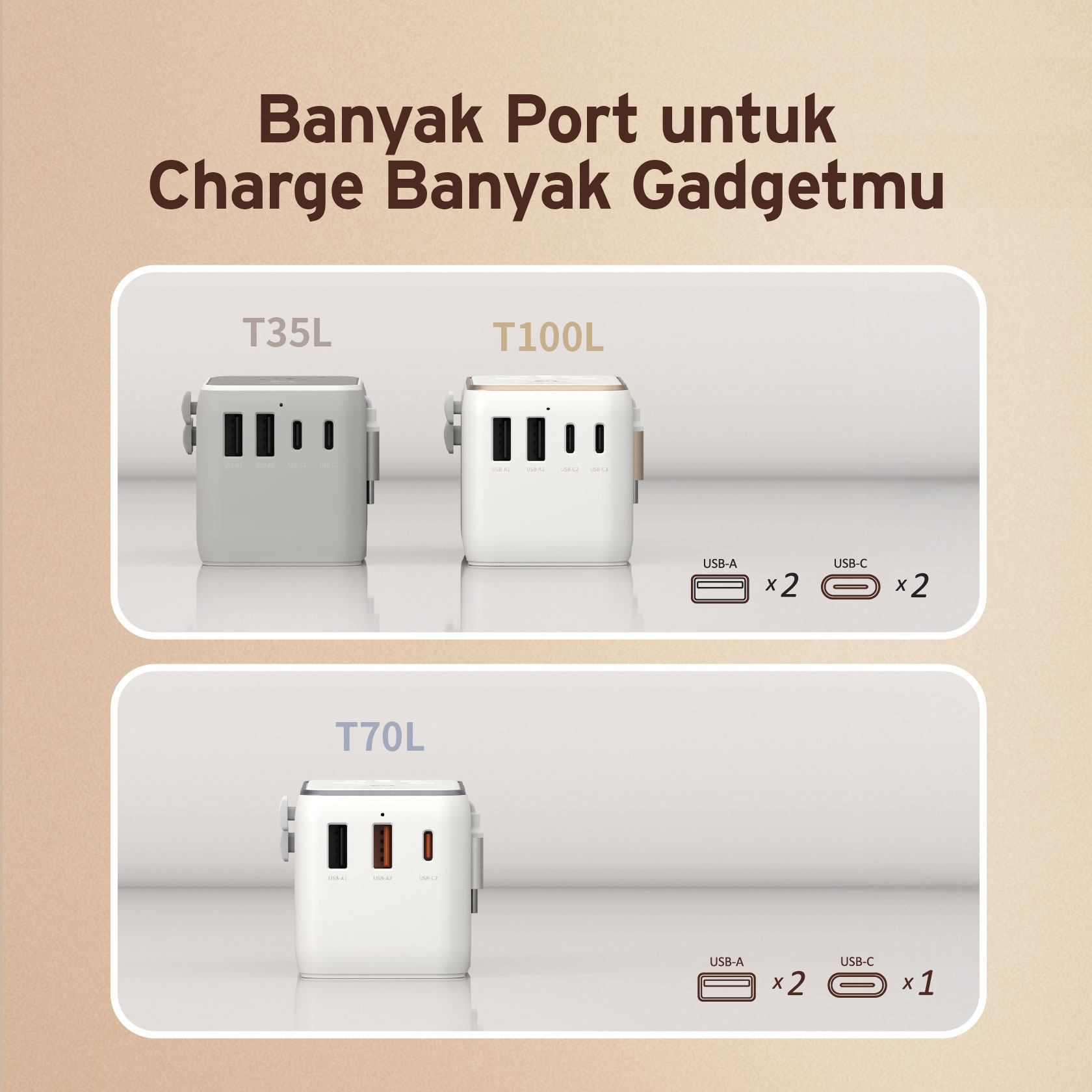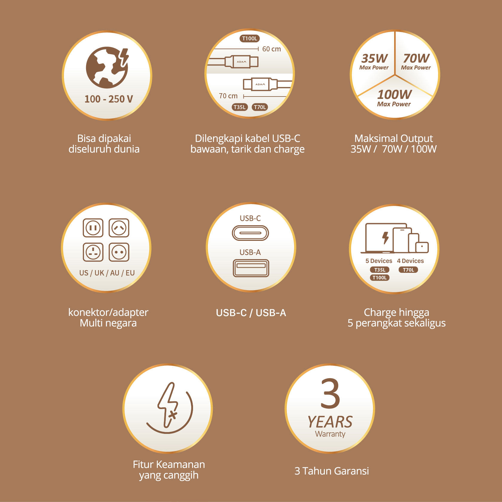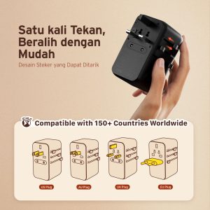 ADAM ELEMENTS – OMNIA T35L TRAVEL ADAPTER WITH BUILT IN USB C CABLE 70 CM – 35W GAN – 2X USB C PORT – 2X USB A PORT – SILVER (840741117465)