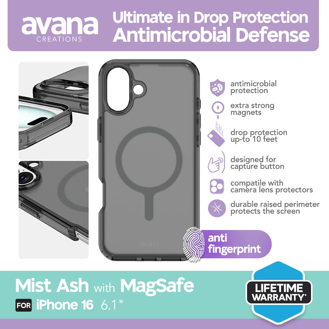 | AVANA CASE FOR IPHONE 16 MAGSAFE MIST – ASH Antimicrobial protection Drop Protection up to 3M/10ft Extra strong magnet (tertanam di antara dua pelat) Action button friendly, mudah mengakses port dan speaker Strap Holder (mudah menambahkan aksesoris seperti lanyard, whristlet atau charm) Compatible with lens protector |