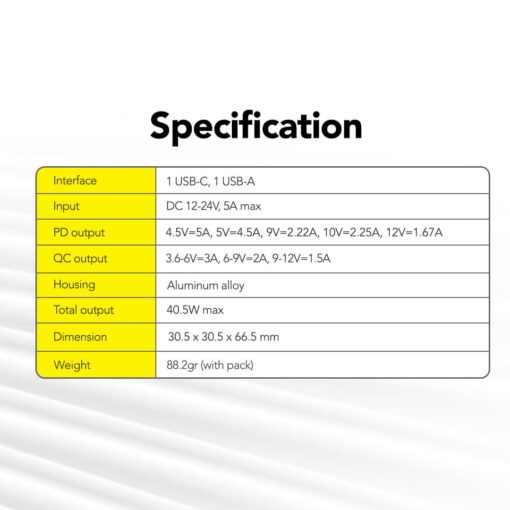 PD Output : 4.5V=5A, 5V=4.5A, 9V=2.22A, 10V=2.25A, 12V=1.67A