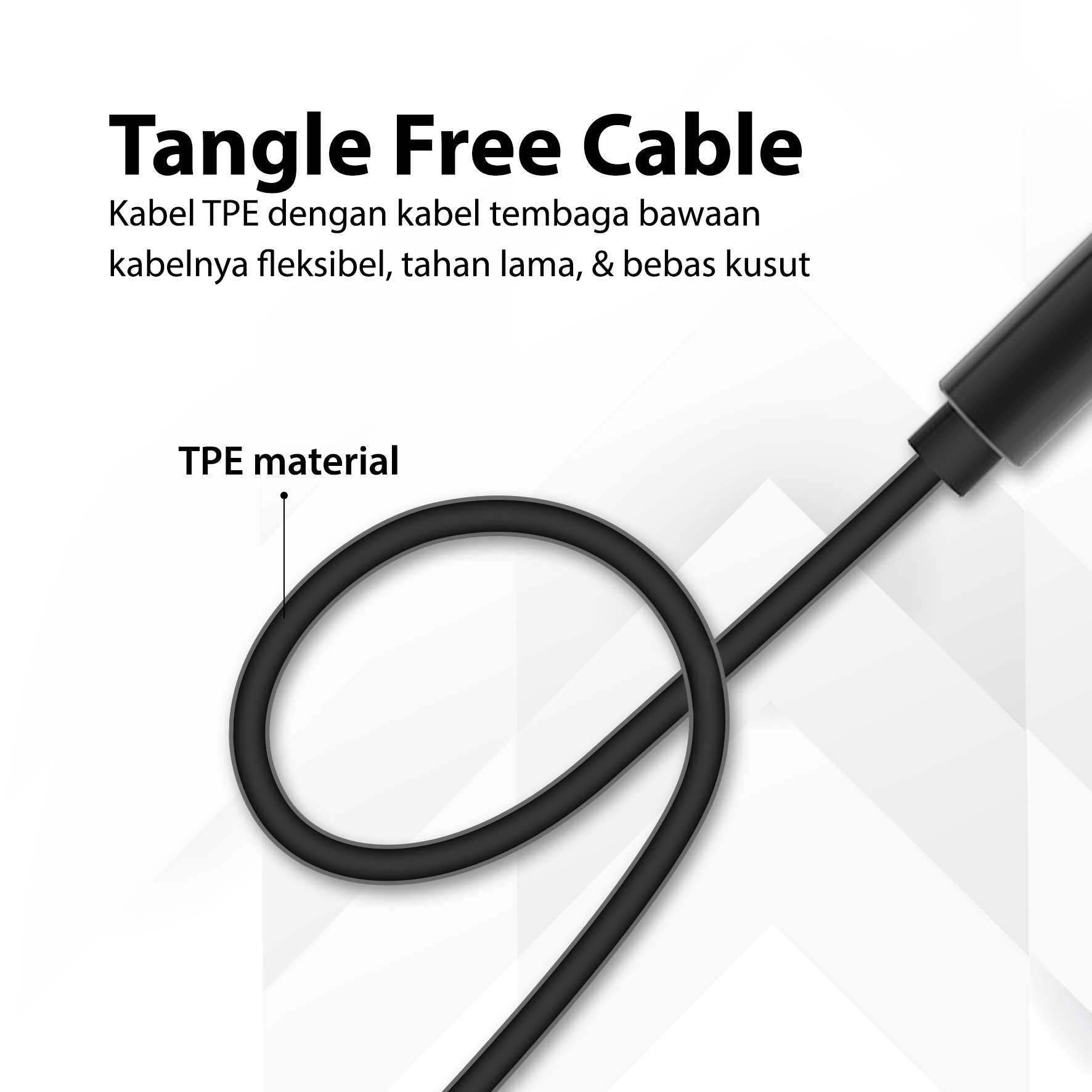 – Tangle Free Cable – Kabel TPE dengan kabel tembaga bawaan kabelnya fleksibel, tahan lama & bebas kusut