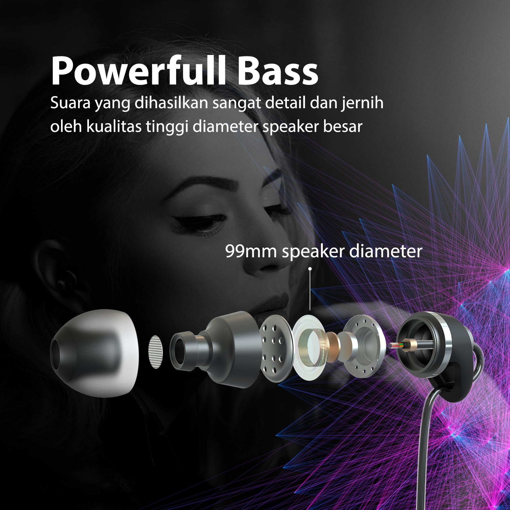 – Powerfull Bass – Suara yang dihasilkan sangat detail dan jernih oleh kualitas tinggi diameter 99mm speaker besar