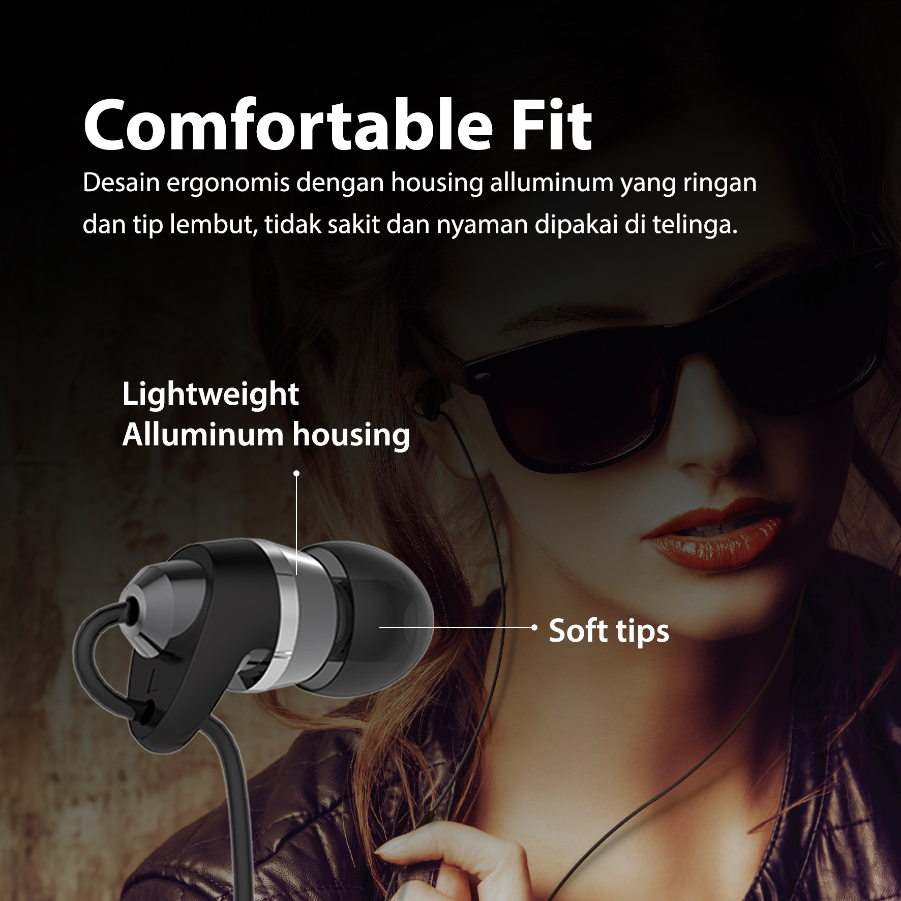 – Desaign ergonomis – housing alluminum yang ringan dan tip lembut, tidak sakit dan nyaman dipakai di telinga
