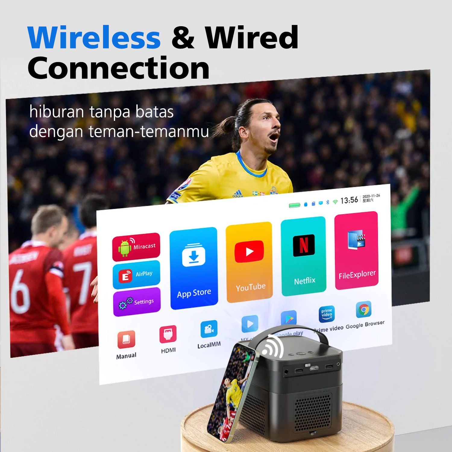 – Bisa terkoneksi menggunakan Wifi, HDMI atau USB