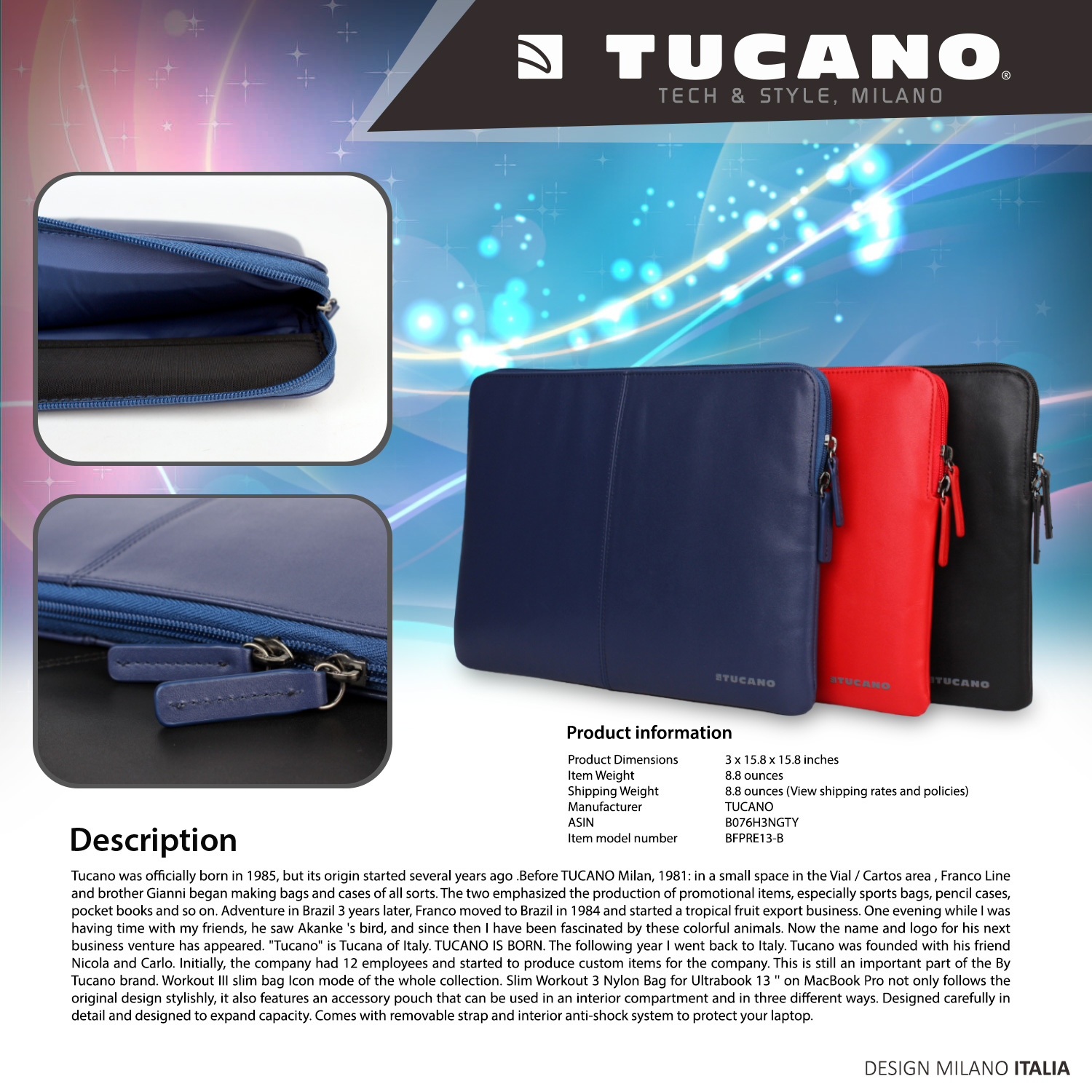 Didirikan tahun 1985, Tucano terus berevolusi memenuhi kebutuhan para pengguna PC hingga laptop. Tucano telah menjual 5 Juta produk setiap tahunnya dan sudah ada di 60 Negara.